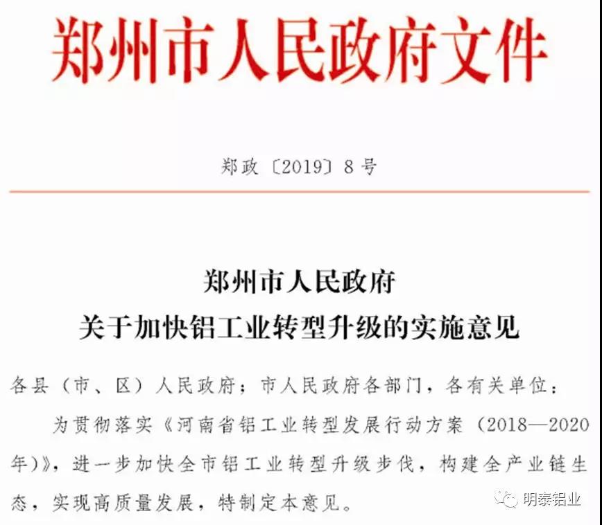 2019年3月18日,為貫徹落實《河南省鋁工業(yè)轉(zhuǎn)型發(fā)展行動方案(2018—2020年)》,鄭州市人民政府印發(fā)了《鄭州市人民政府關(guān)于加快鋁工業(yè)轉(zhuǎn)型升級的實施意見》(以下簡稱《意見》),《意見》對全市鋁工業(yè)發(fā)展進(jìn)行了明確的要求和全面的部署。明泰鋁業(yè)近年來加快了轉(zhuǎn)型升級、綠色化改造、創(chuàng)新發(fā)展及智能化改造的步伐,與鄭州市政府對鋁加工行業(yè)的要求和部署不謀而合。