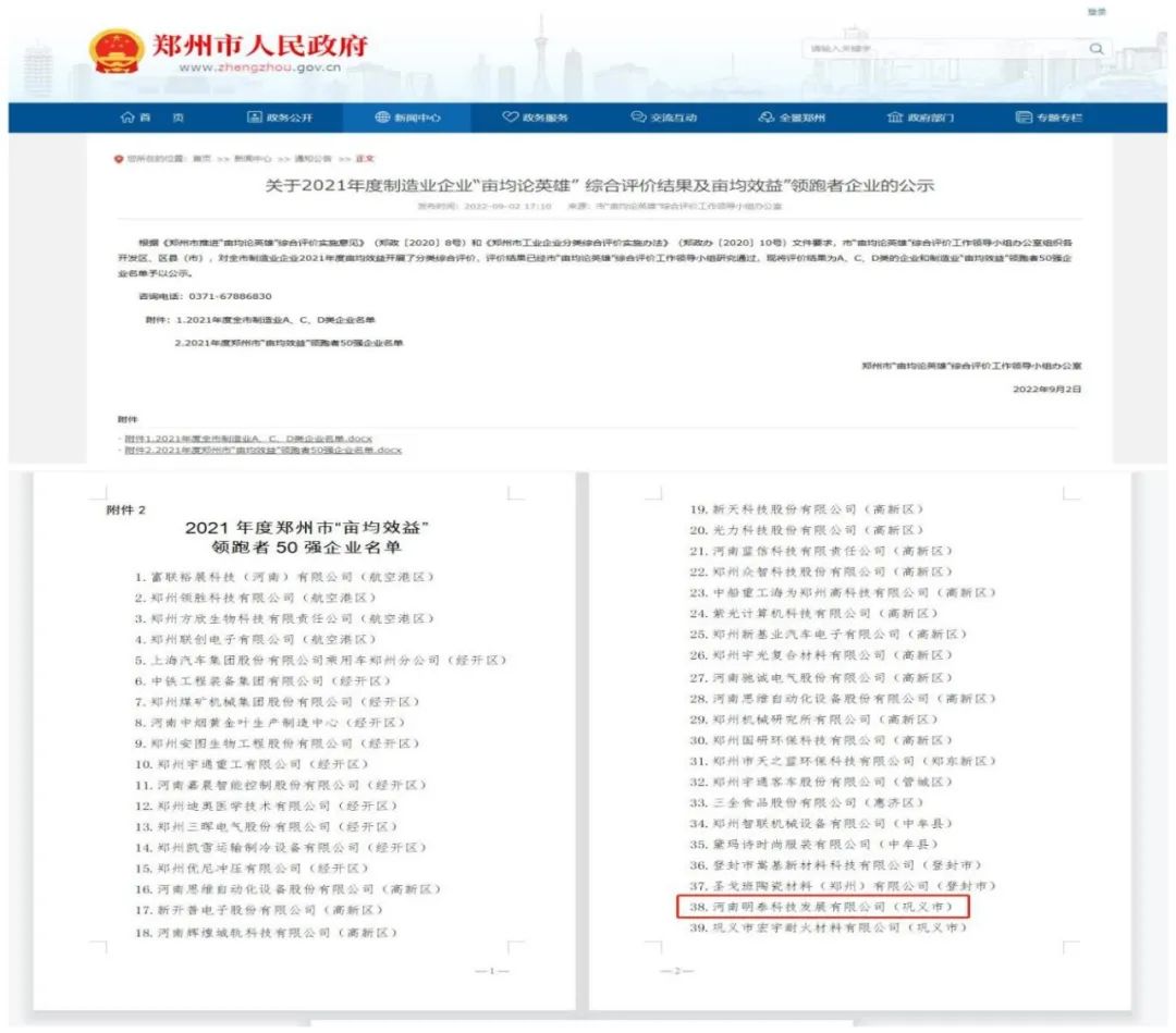 近日,鄭州市“畝均論英雄”綜合評價工作領(lǐng)導(dǎo)小組辦公室發(fā)布“2021年度鄭州市“畝均效益”領(lǐng)跑者50強企業(yè)名單”,河南明泰科技發(fā)展有限公司成功入選!