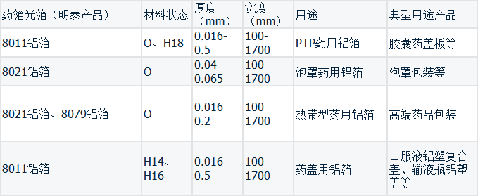 | 藥箔光箔(明泰產(chǎn)品) | 材料狀態(tài) | 厚度(mm) | 寬度(mm) | 用途 | 典型用途產(chǎn)品 |